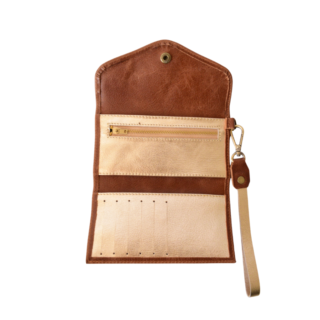 Esta moderna billetera bicolor, confeccionada en cuero café engrasado combinado con dorado, destaca por su estilo único y lleno de personalidad. Dispone de monedero con cierre, 3 compartimientos para billetes y espacio para 6 tarjetas.